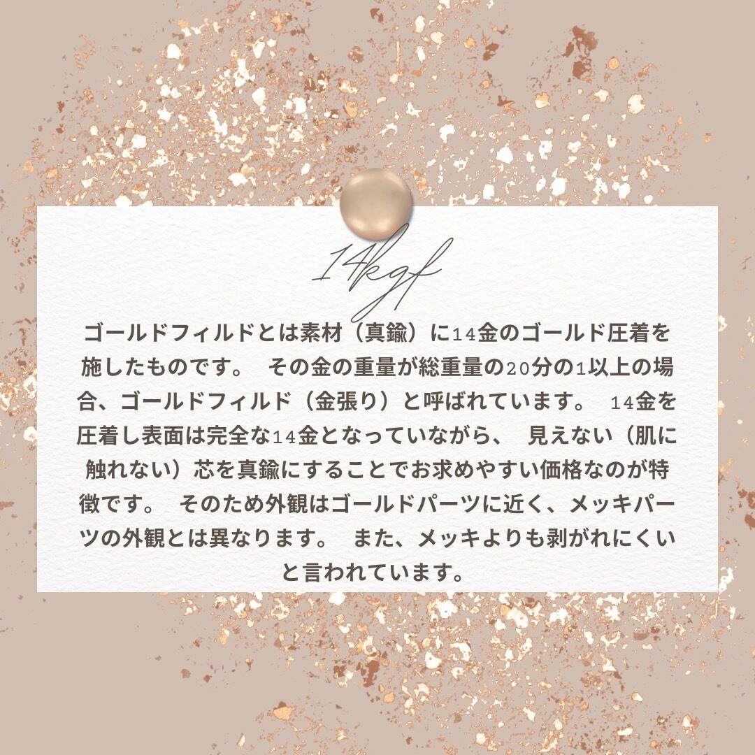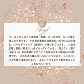 ゴールドフィルドとは素材(真鍮)に14金のゴールド圧着を施したものです。 その金の重量が総重量の20分の1以上の場合、ゴールドフィルド(金張り)と呼ばれています。 14金を圧着し表面は完全な14金となっていながら、 見えない(肌に触れない)芯を真鍮にすることでお求めやすい価格なのが特徴です。 そのため外観はゴールドパーツに近く、メッキパーツの外観とは異なります。 また、メッキよりも剥がれにくいと言われています。